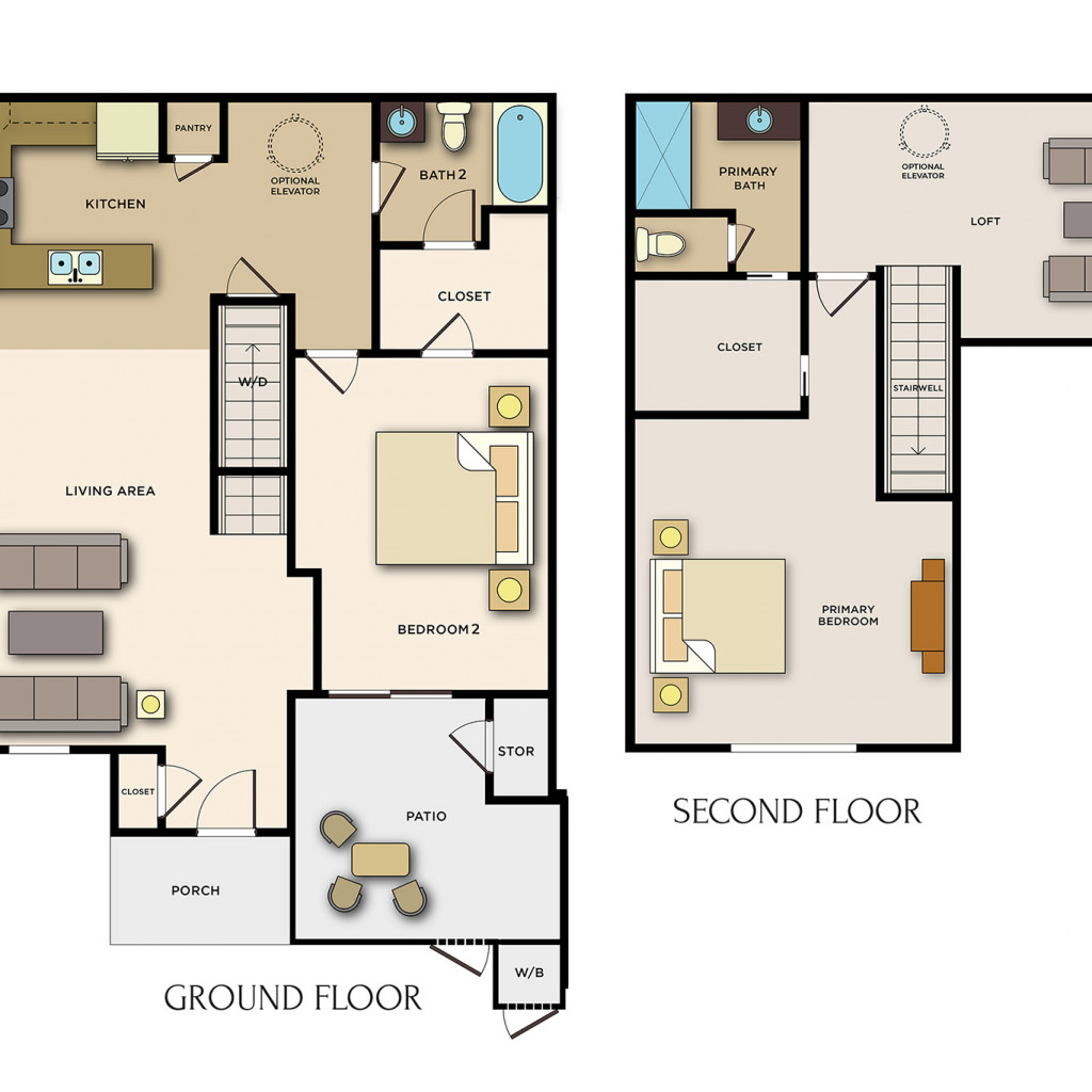 The first-floor primary suite ensures accessibility and ease, while the second suite upstairs retreat features a spa-inspired bathroom, a generous walk-in closet, and a versatile loft that adapts to your lifestyle.
