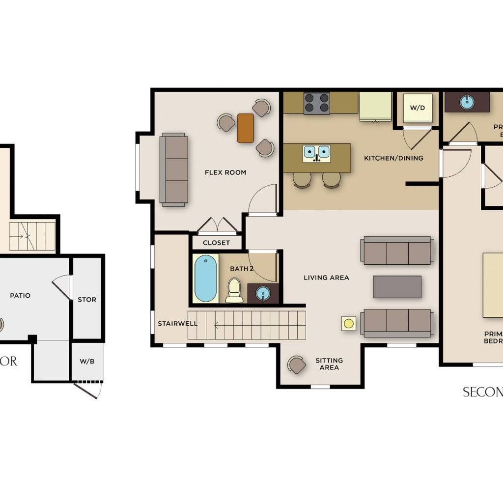The open kitchen with a bar island becomes the heart of your day, whether for morning coffee, casual meals, or hosting. A cozy sitting area adds warmth, while a flex room allows you to create your perfect space for a media room, office, or guest room.